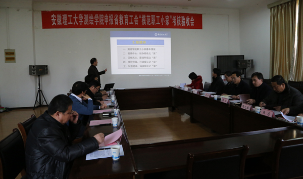 下午3:00,考核组专家在测绘学院多功能厅召开验收汇报会。出席会议的专家有省教育工会主席凤桦、副主席唐成、处长王锦生,淮北师范大学工会主席陶元春,阜阳师范学院工会主席吴学军,淮南师范学院工会主席朱志。会议由凤桦主持。
