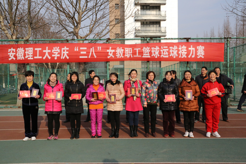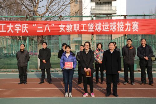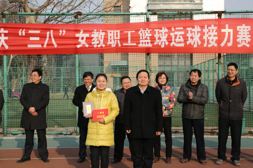 为隆重庆祝“三八”国际劳动妇女节,丰富女教职工的节日生活,3月7日下午,校工会在校本部田径运动场举办了女教职工篮球运球接力赛,包括离退休人员在内的16个代表队近百名女教职工参加了接力。人事处处长马芹永,计算机科学与工程学院党委书记宋克俭,地球与环境学院副院长、校女工委主任宋晓梅分别为获奖代表队颁奖。校工会副主席夏邦权主持颁奖仪式。